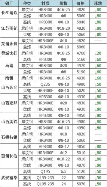 下調8家,占比80%,調價幅度30-80元/噸;